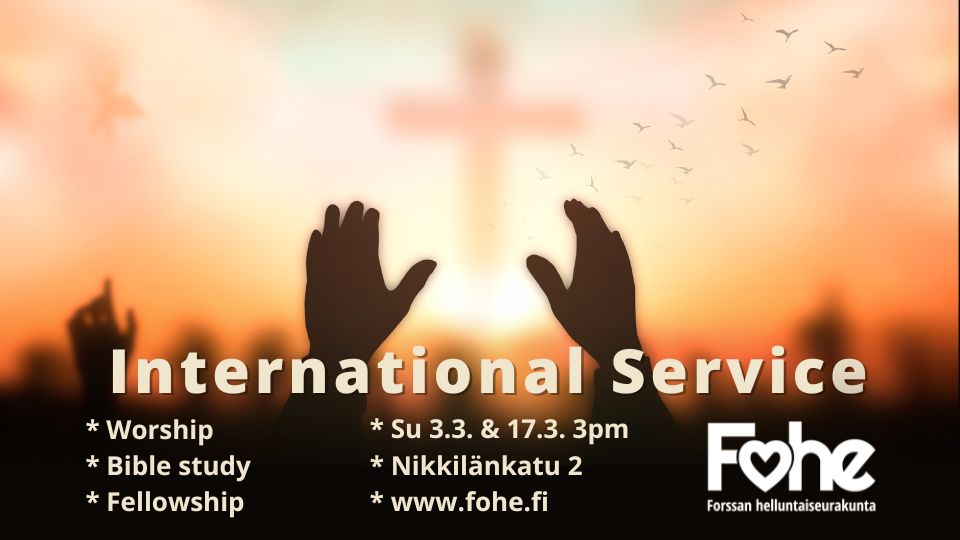 Welcome to join us on Sunday March 3 and 17 at 3pm. Our meeting consists of worship, Bible study and fellowship. You are warmly welcome to participate! Our international community has people around the world. For more information, please contact, Rose Ipia, 040-913 7513.