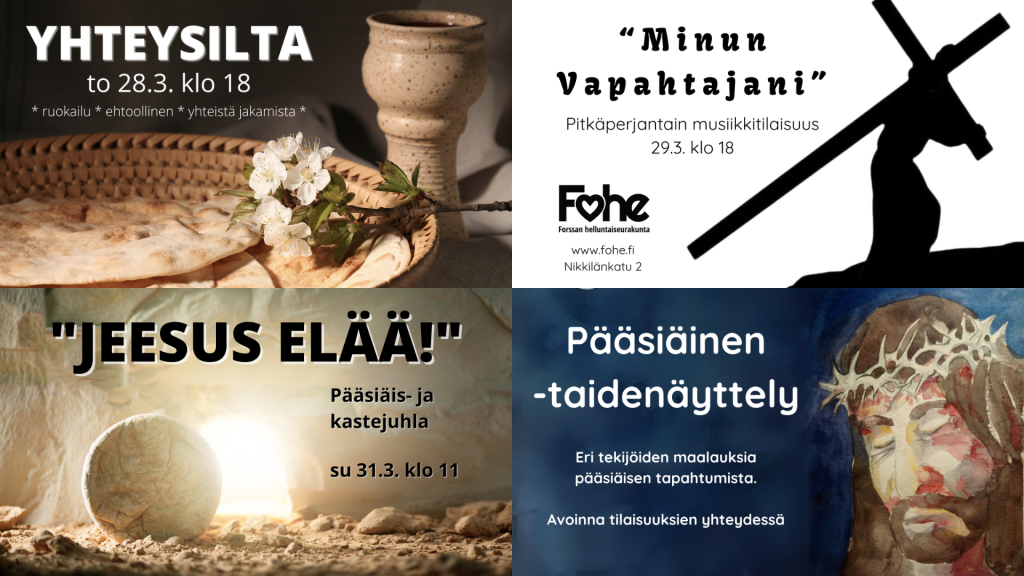 Tilaisuuksien yhteydessä voit tutustua Pääsiäinen-taidenäyttelyyn seurakuntamme alakerrassa.