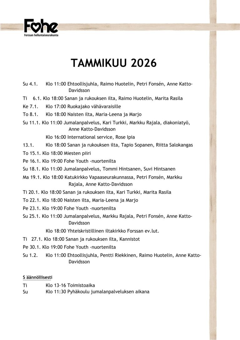 Vuosi on hyvä aloittaa yhdessä rukoillen. Me emme vielä tiedä loppuvuoden asioita, mutta Jumala tietää. Pyydetään häneltä niin johdatusta kuin varjelustakin seurakunnalle ja omaan elämään. Rukouspäivien tiistaista 9.1. torstaihin 11.1. aikana rukouskokoukset joka päivä klo 12 ja 18. Tervetuloa mukaan rukoilemaan!